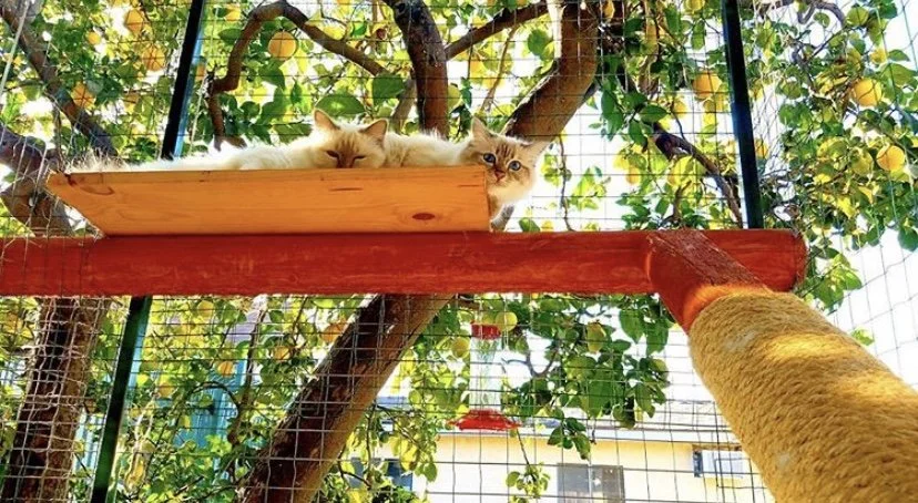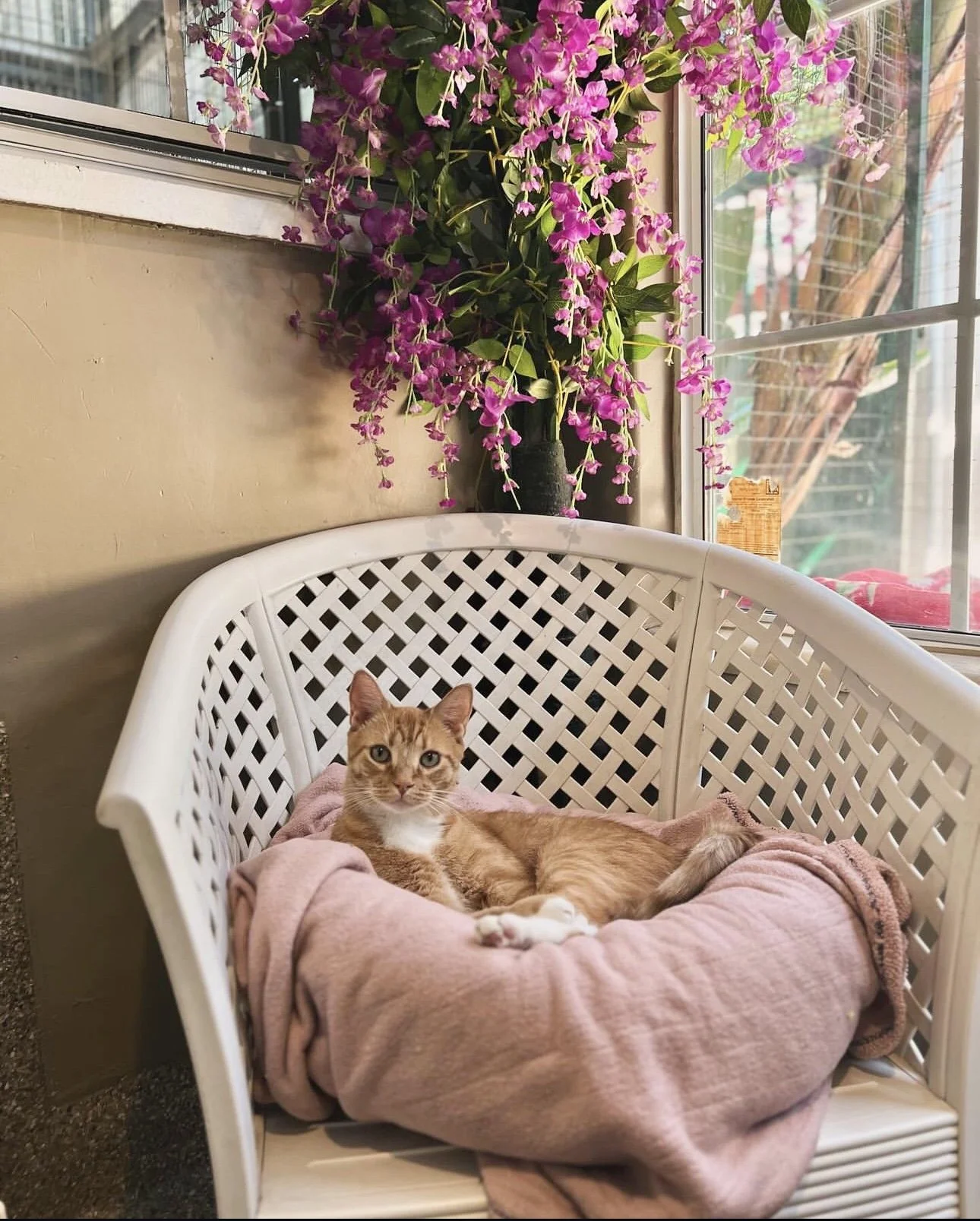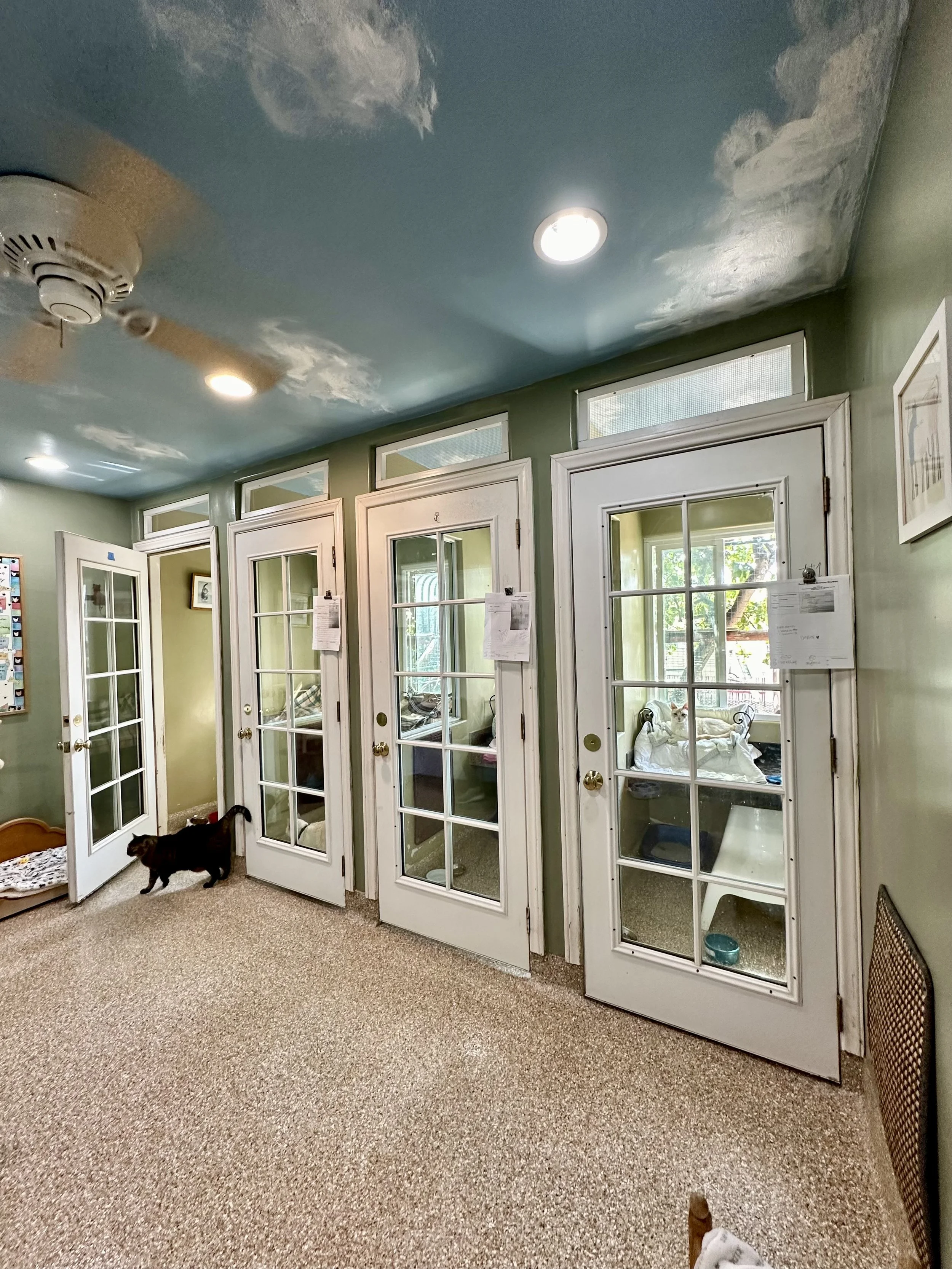 Our cats' room is surrounded with windows to enjoy natural light and a view of our garden. Each cat is given his/her own personal bed which is washed and sanitized. Easy-listening music is played during the day. They also enjoy complimentary snacks while watching cartoons and cat videos. Private VIP french doors are also available.