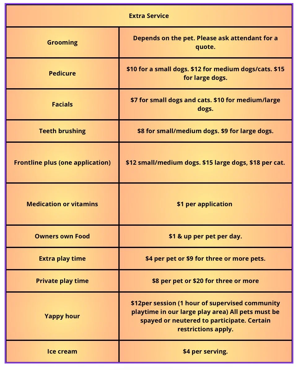 Boarding rates are based on calendar days. Charges begin the day you check in (regardless of the time). Check-out time is 11:00 a.m. Any pets picked-up after 11:00 am will be charged for Daycare fee of $25 per pet; unless your pet was bathed or groomed on the day of departure.