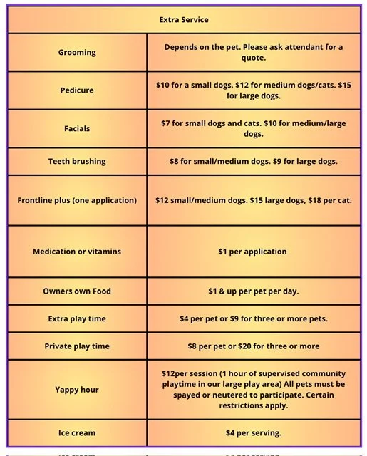 Boarding rates are based on calendar days. Charges begin the day you check in (regardless of the time). Check-out time is 11:00 a.m. Any pets picked-up after 11:00 am will be charged for Daycare fee of $22 per pet (cats $16); unless your pet was bathed or groomed on the day of departure.